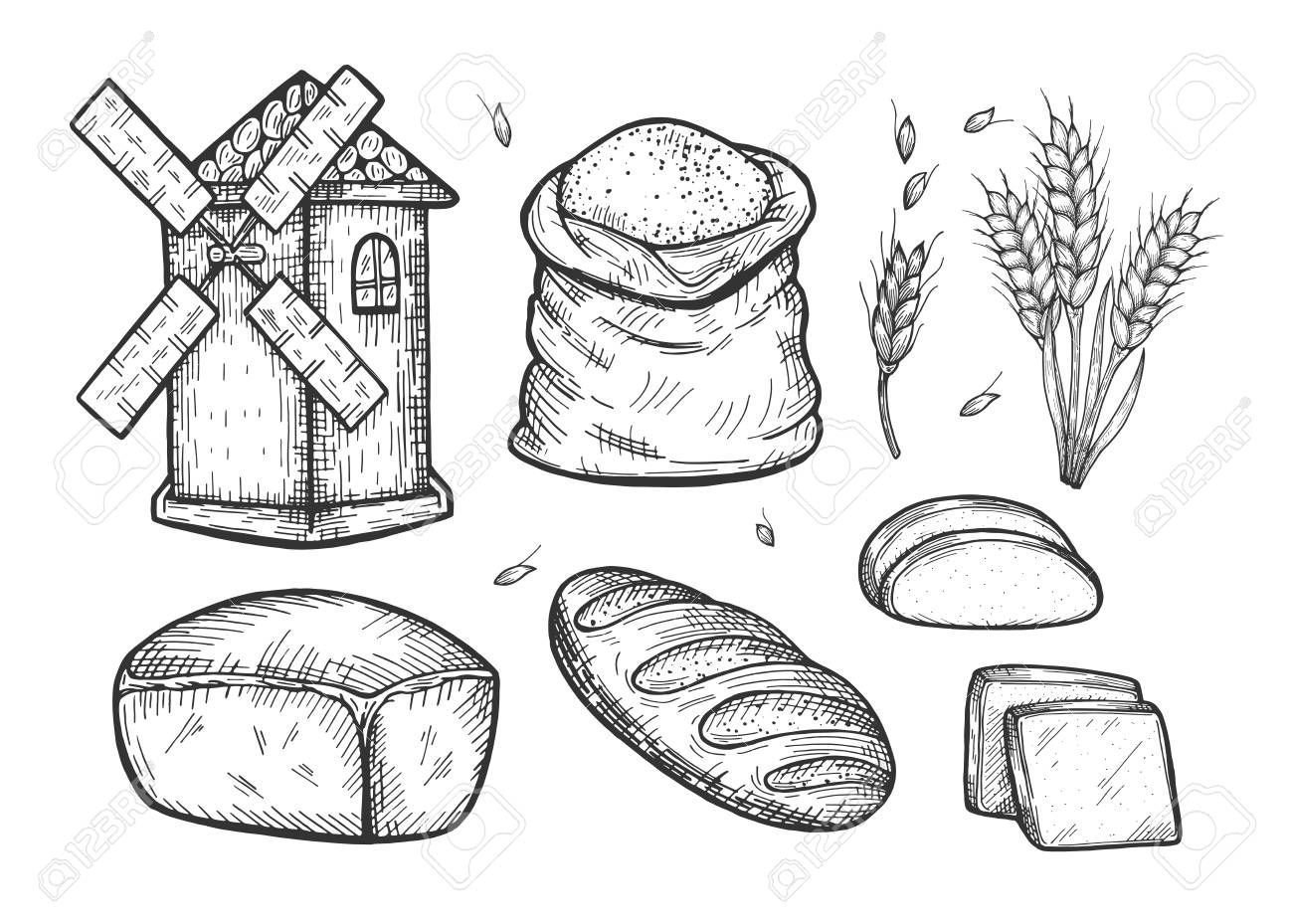 Рисунок хлеба и хлебобулочных изделий, мельница