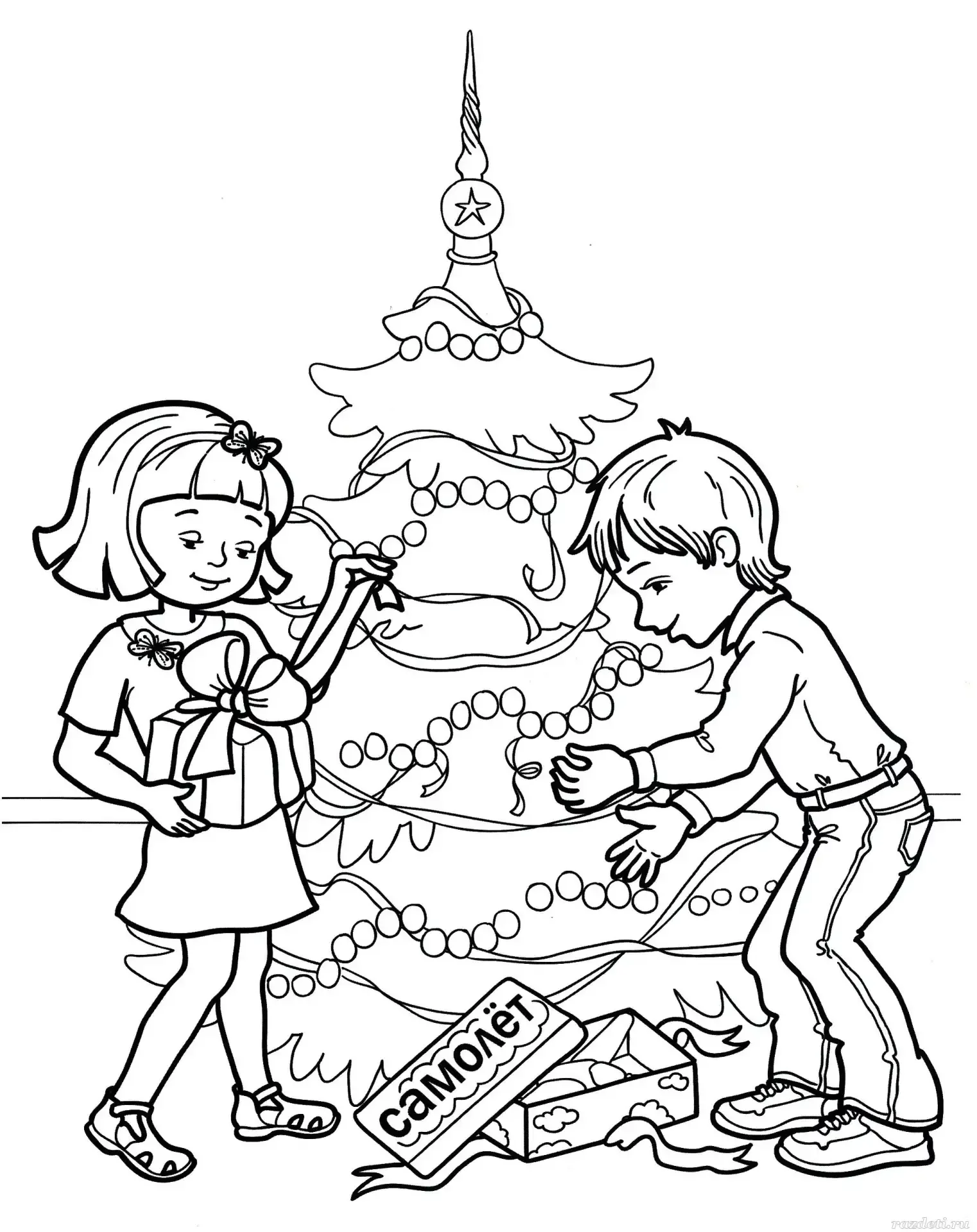 Дети наряжают елку раскраска