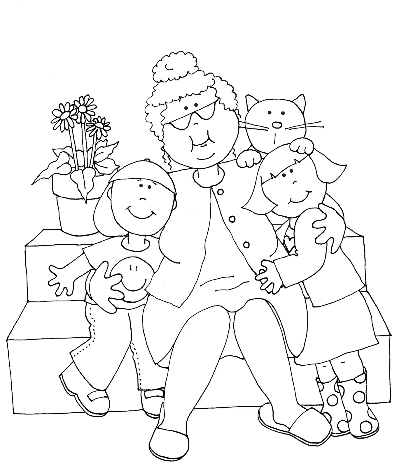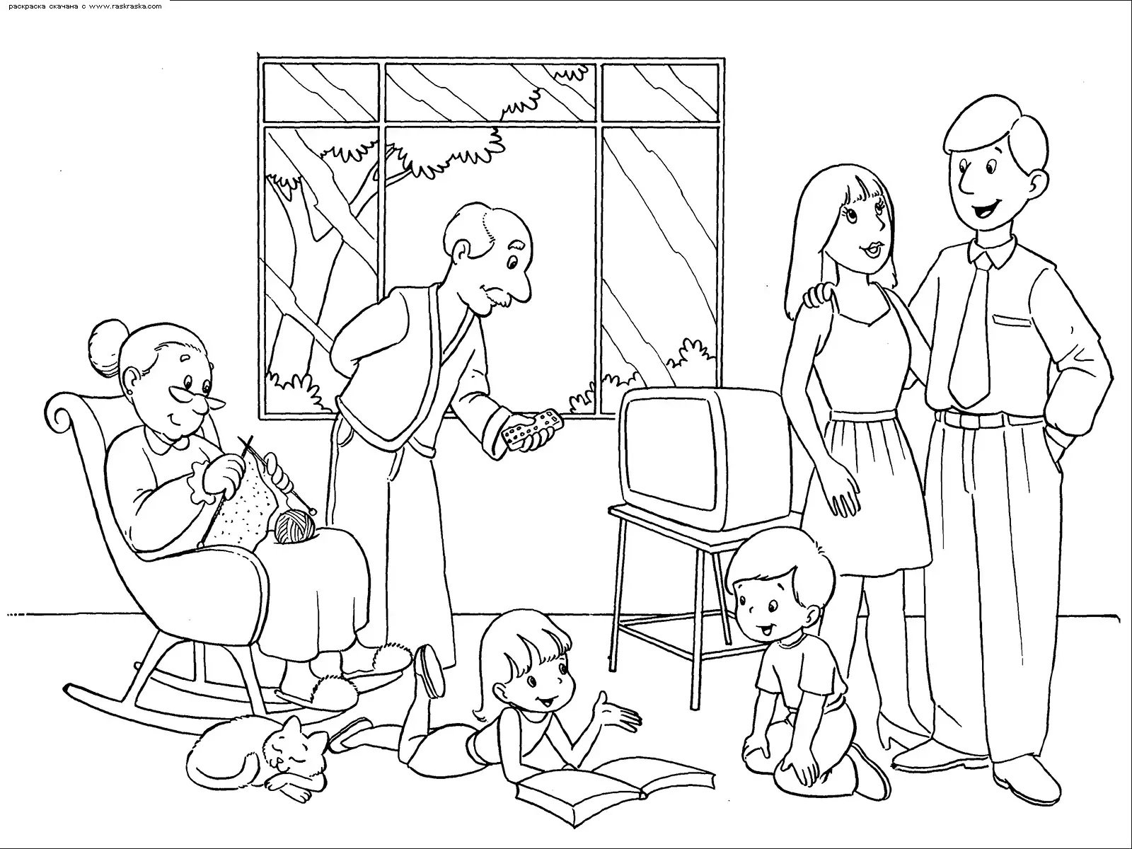 Раскраска бабушка и дедушка с внуками