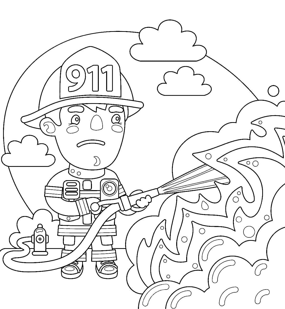 Раскраска пожарник тушит пожар