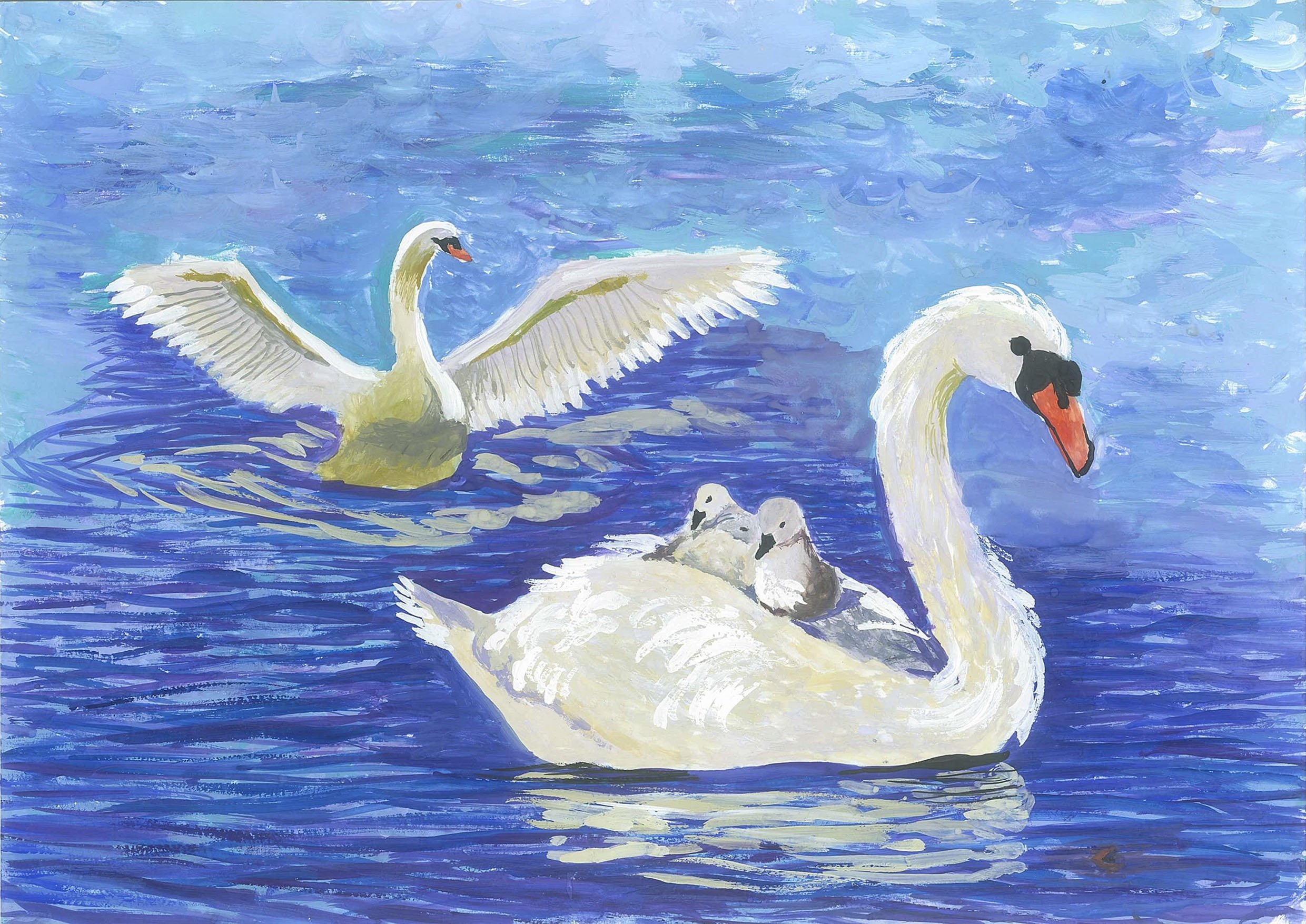 Лебедь рисунок красками