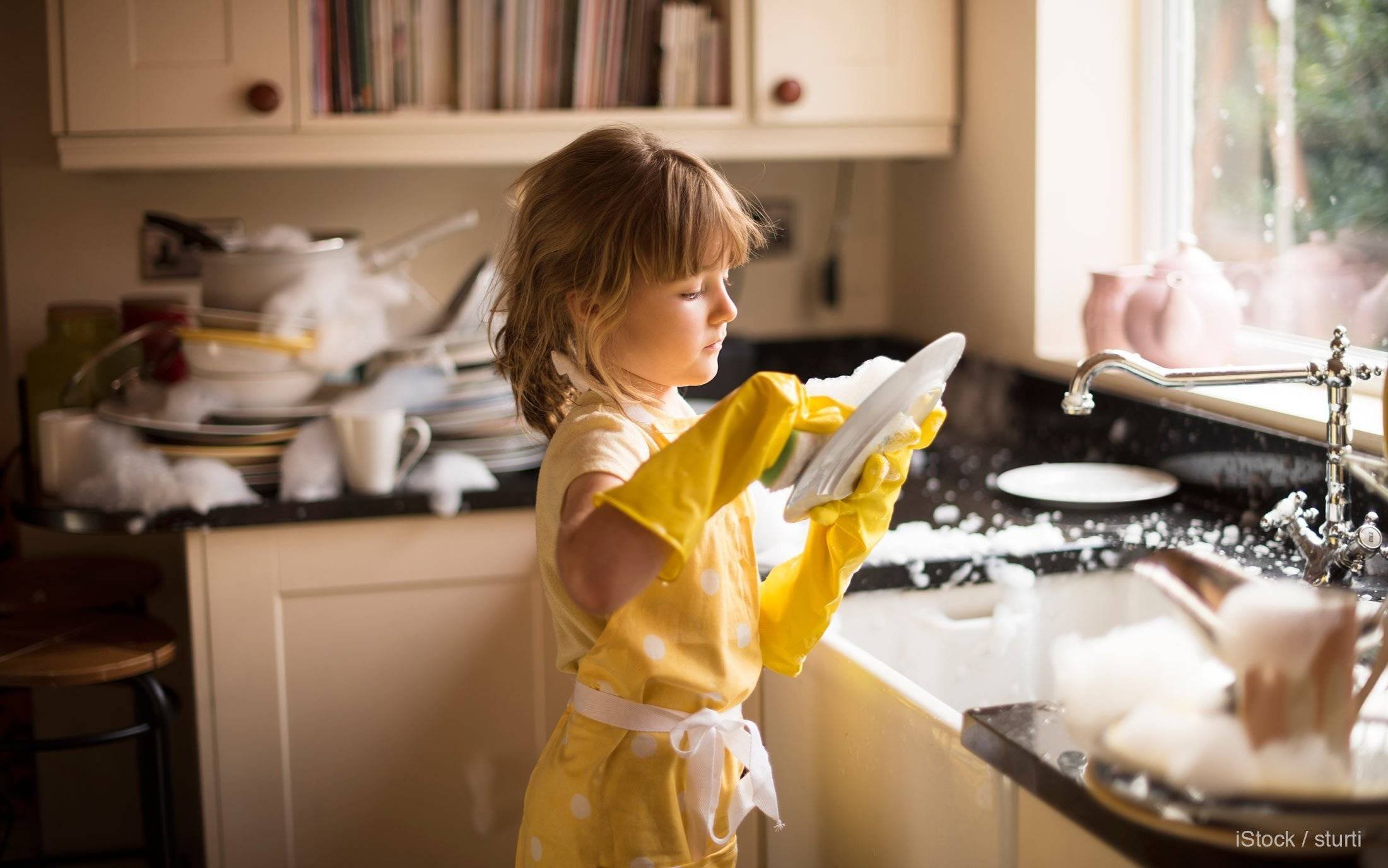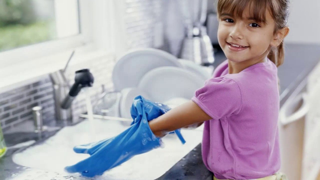 Девочка моет посуду
