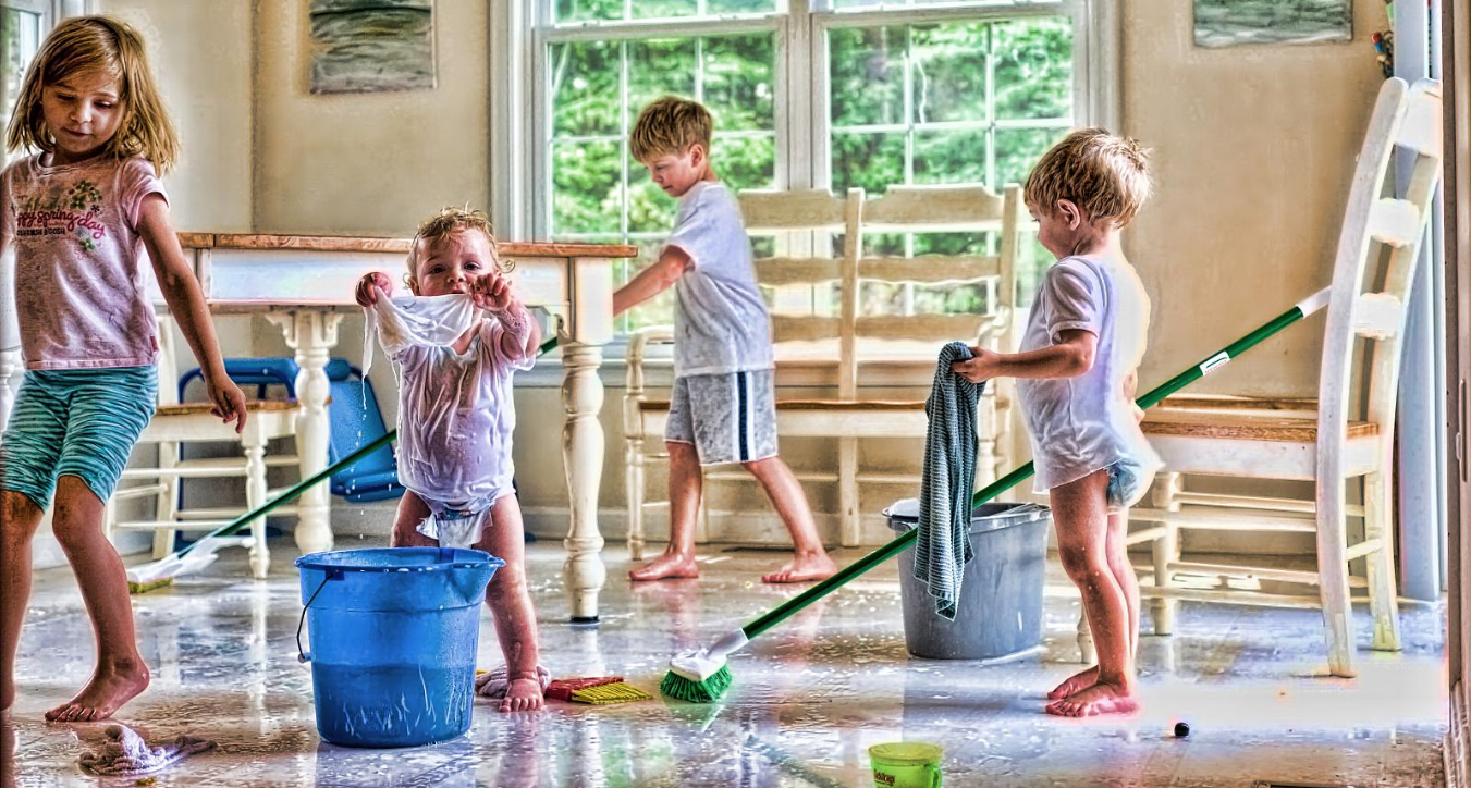 Дети убираются в доме