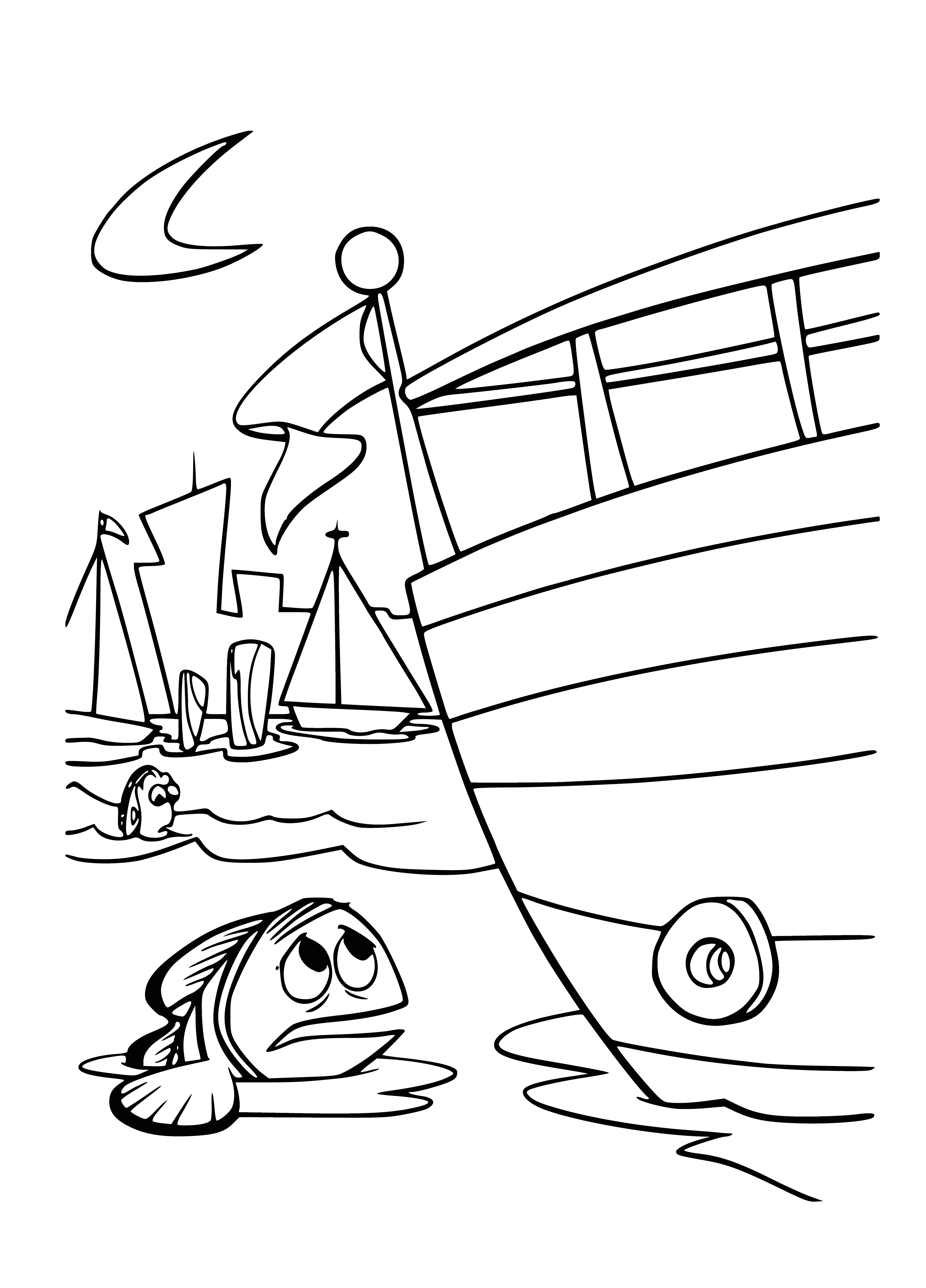 Раскраску для детей рыбки и лодка