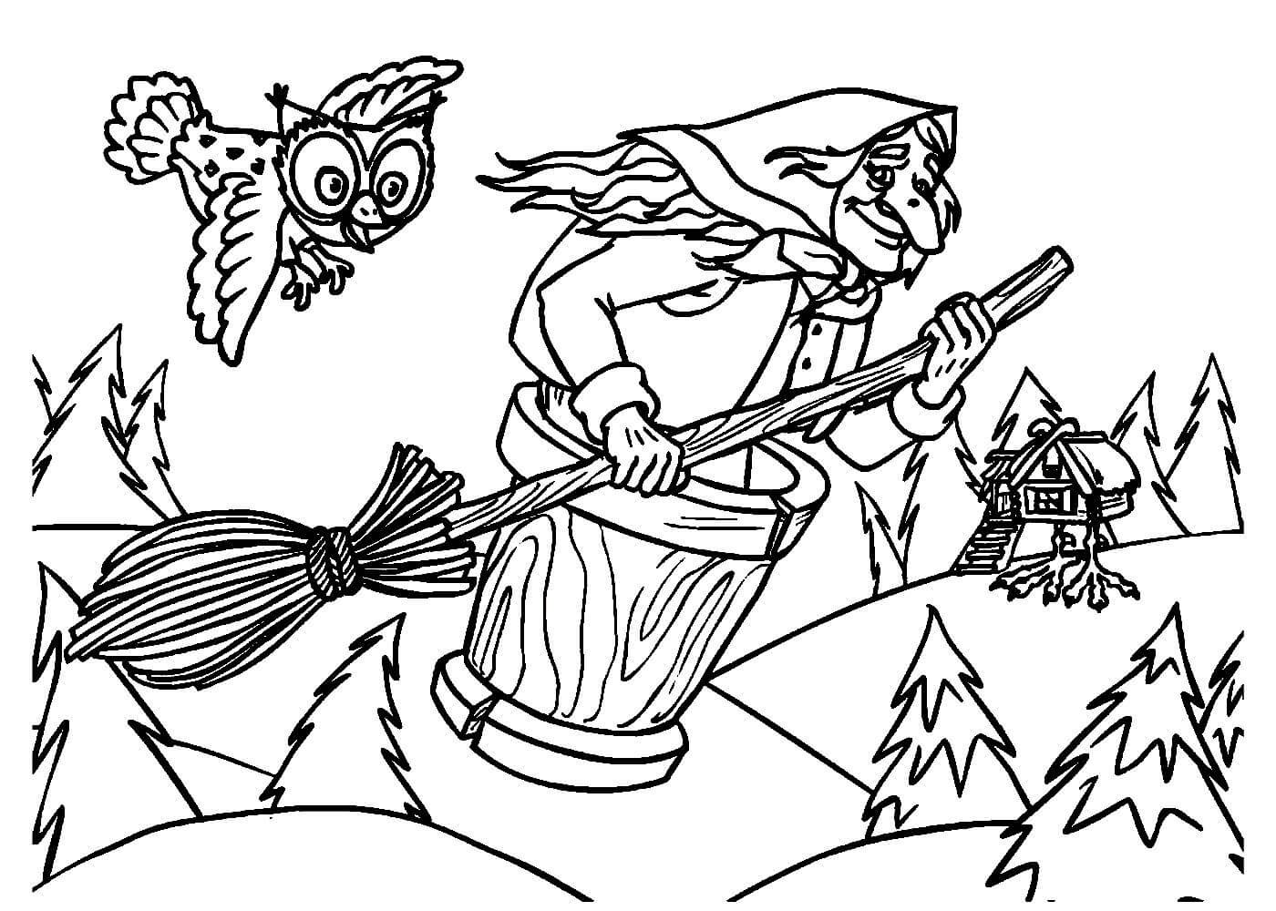 Баба Яга в ступе раскраска для детей